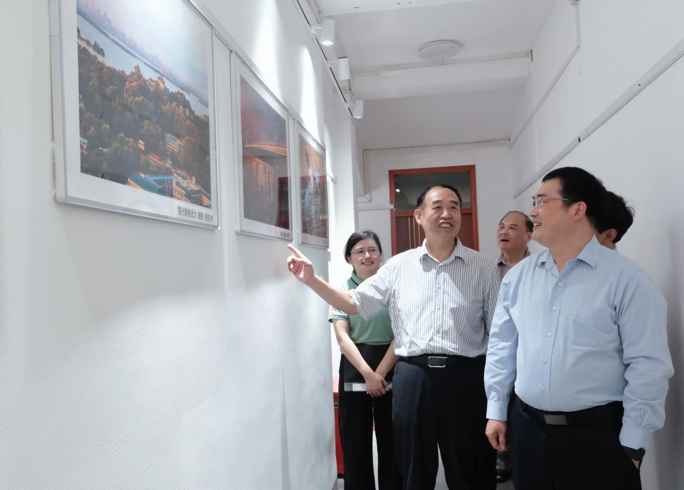 楚龙强宣布新利客服离退休教职工庆祝新中国成立75周年书画、摄影、手工艺作品展正式开幕。开幕式后,楚龙强与老同志们一起参观了展览。