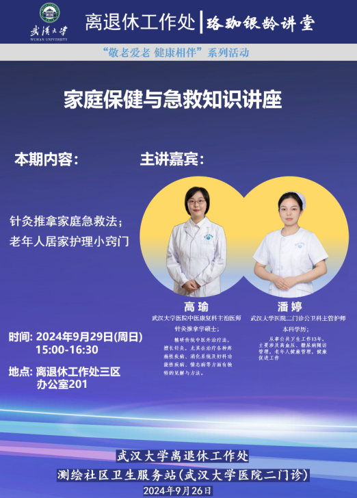 9月29日下午,新利18平台登录入口联合新利客服医院二门诊、中医康复科开展珞珈银龄讲堂之“敬老爱老 健康相伴”系列活动——家庭保健与急救知识。本次活动在新利18xl三区办公室举办。