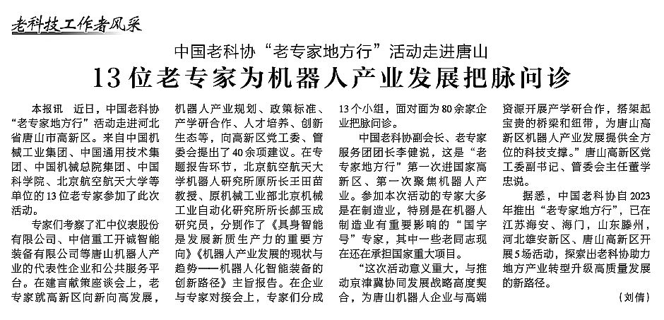 10月9日,《中国老年报》刊登了《13位老专家为机器人产业发展把脉问诊》新闻,报道由我校原党委书记、中国老科协副会长李健教授带队组织的中国老科协 “老专家地方行” 进唐山活动。13位来自中国机械工业集团、中国通用技术集团、中国机械总院集团、中国科学院、北京航空航天大学等单位的老专家走进河北省唐山市高新区,聚焦机器人产业,深入代表性企业和公共服务平台考察调研,为80余家企业把脉问诊,为高新区党工委、管委会出谋划策,针对产业规划、政策标准、产学研合作、人才培养、创新生态等建言献策40余项,为推动唐山市机器人产业高质量发展注入新的活力。