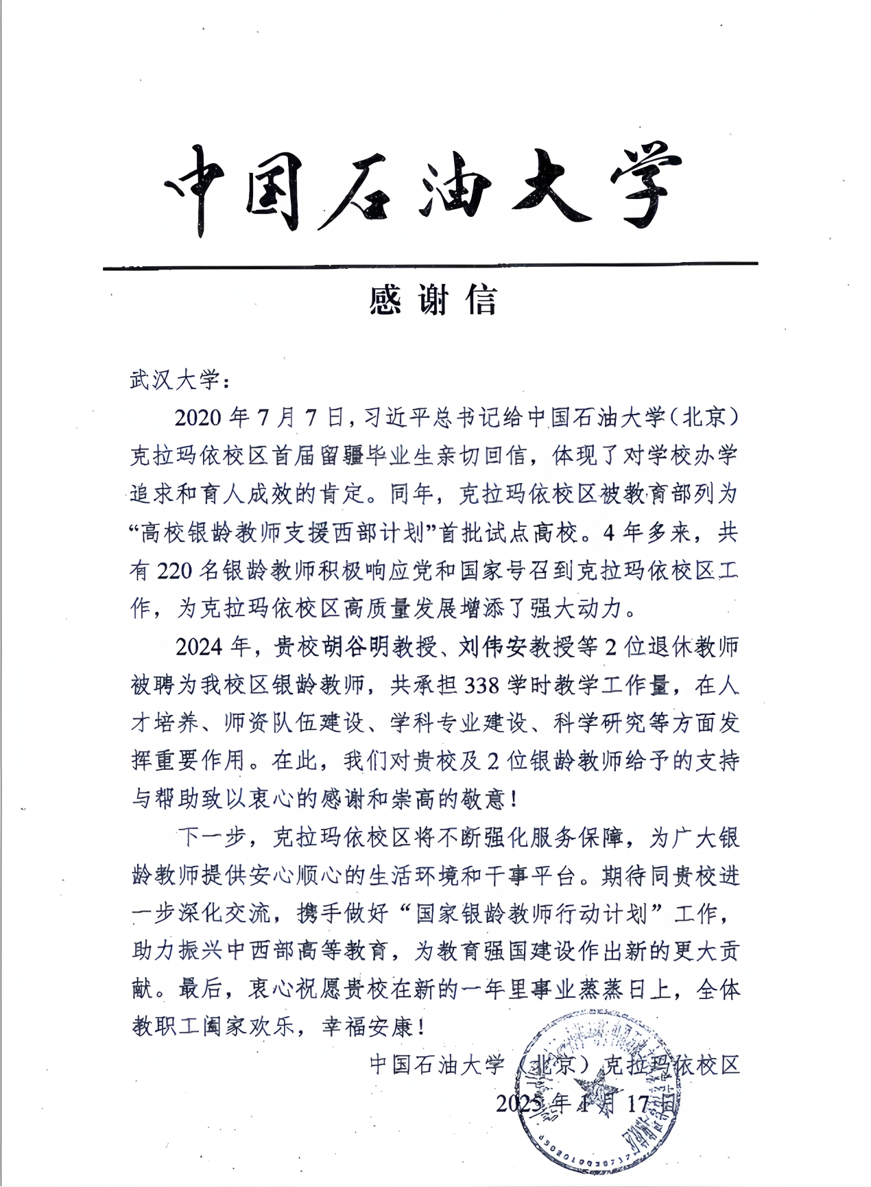 近日,中国石油大学(北京)克拉玛依校区再次向学校发来感谢信,对新利客服及学校退休教授胡谷明、刘伟安2024年继续投身“高校银龄教师支援西部计划”,支援西部高等教育发展表示衷心的感谢。信中特别提到,两校在银龄教师合作中结下深厚情谊,期待进一步深化两校交流,携手做好“国家银龄教师行动计划”工作,助力中西部高等教育,为教育强国建设作出新的更大贡献。