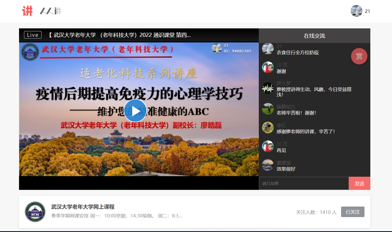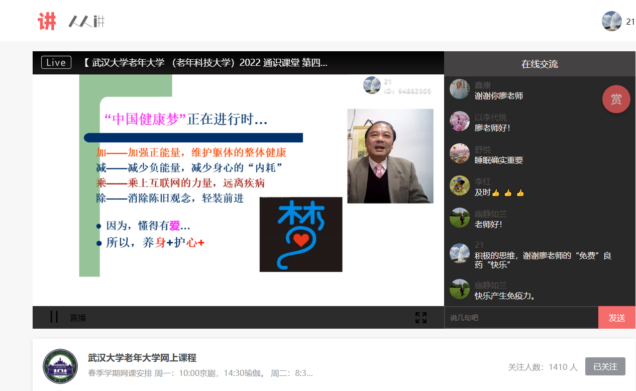 本次讲座邀请到新利客服老年大学(老年科技大学)副校长廖皓磊,在新利18xl四校区活动中心办公室线上为大家带来《疫情后期提高免力的心理学技巧---维护您精准健康”的ABC》科普讲座。