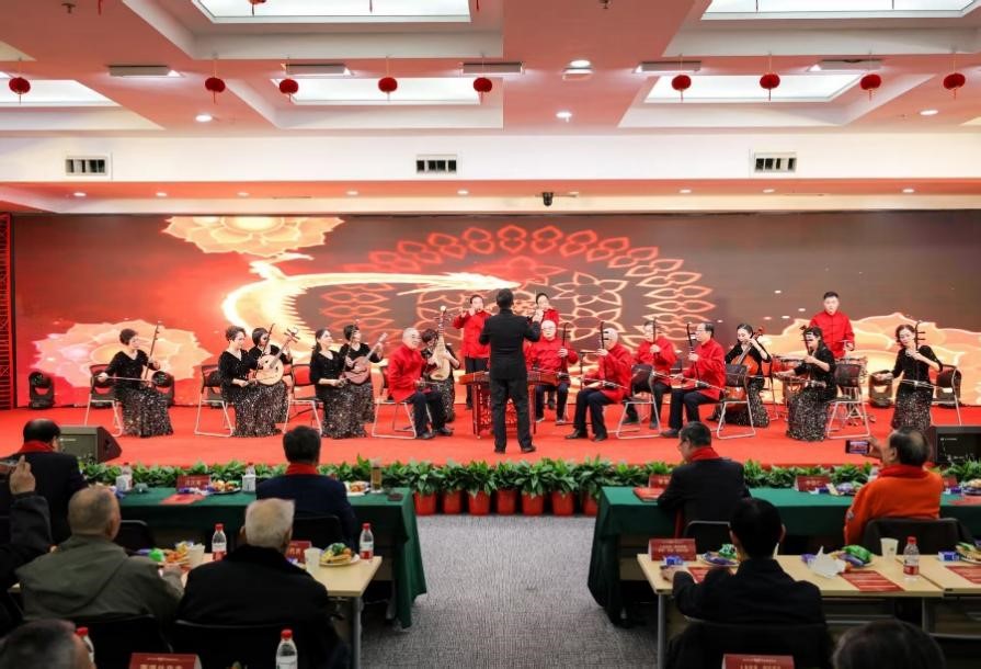 新利客服2025年新春茶话会上,老年艺术团民乐团以经典曲目《金蛇狂舞》作为开场节目亮相。欢快的锣鼓与激昂的旋律瞬间点燃现场气氛,二胡、扬琴、笛子等传统乐器交相辉映,奏响对全校师生的新春祝福,赢得全场热烈掌声。