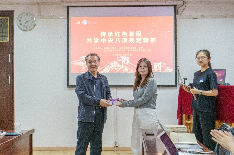 活动现场,信息学部机关退休一支部书记蒋锁奋代表老党员群体,向哲学学院学生党员代表朱巧赠送《习近平关于加强党的作风建设论述摘编》。这些承载着党的理论精髓的书籍,不仅是知识的传递,更饱含着离退休老党员对青年党员的深情厚望。