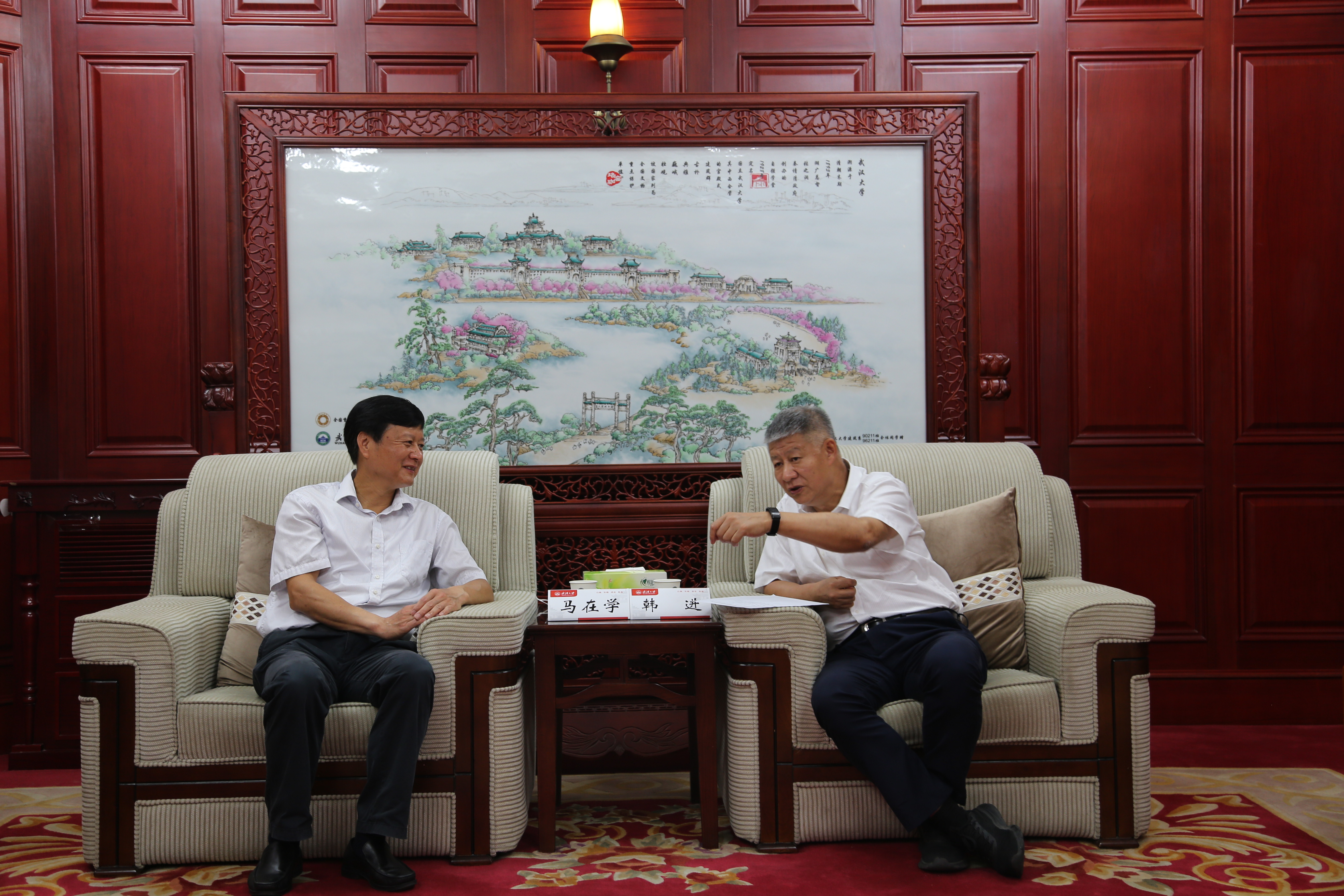 座谈会前,校党委书记韩进、党委副书记赵雪梅在行政楼贵宾室会见马在学一行。