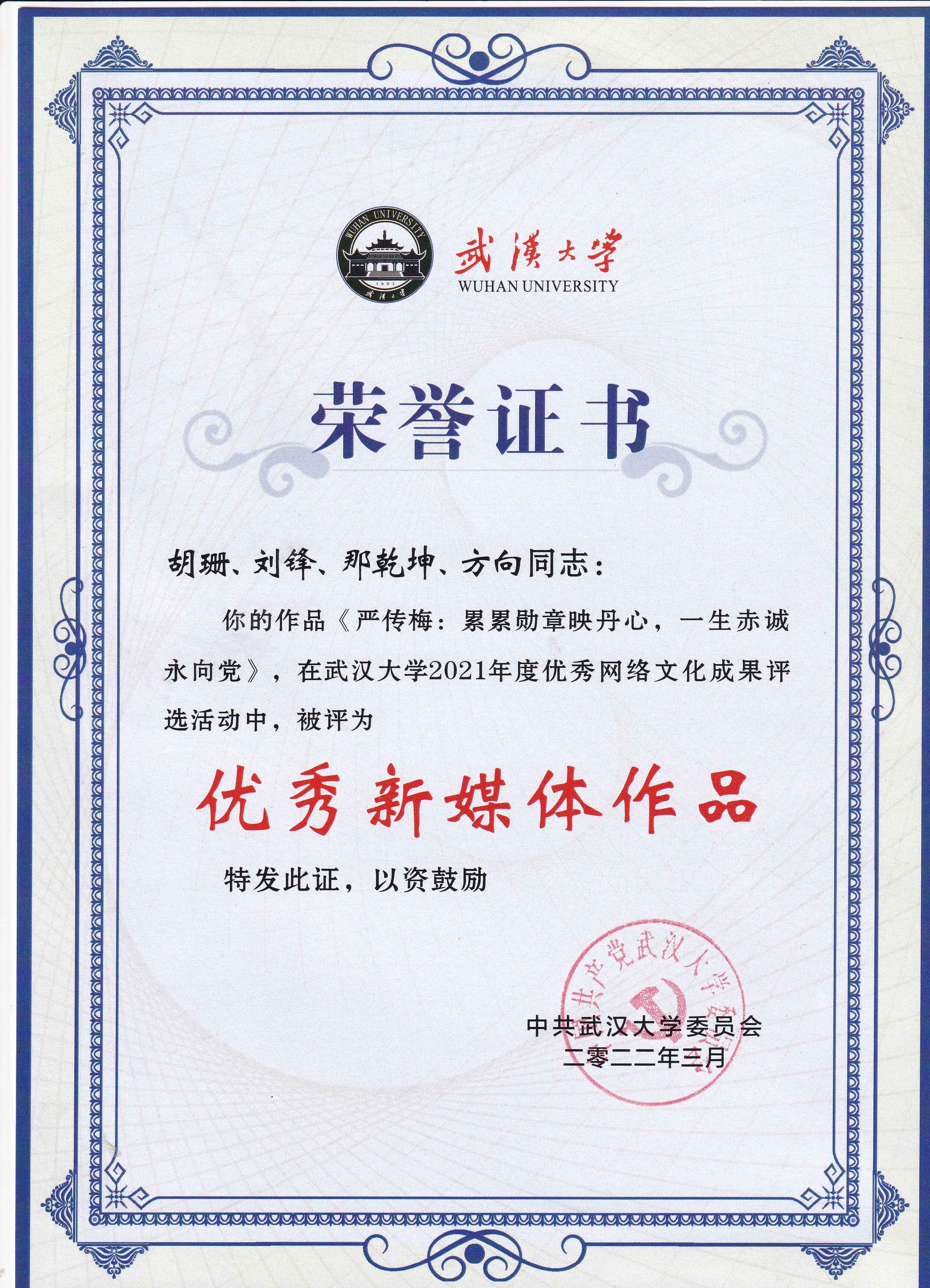 3月25日,学校召开2022年宣传思想工作会。会上颁发了新利客服2021年度优秀网络文化成果奖,校党委副书记沈壮海为获奖代表颁奖。新利18xl的视频作品《严传梅:累累勋章映丹心 一生赤诚永向党》荣获学校2021年度“优秀新媒体作品”,全校共10个。作品由胡珊、刘锋、那乾坤、方向共同创作。