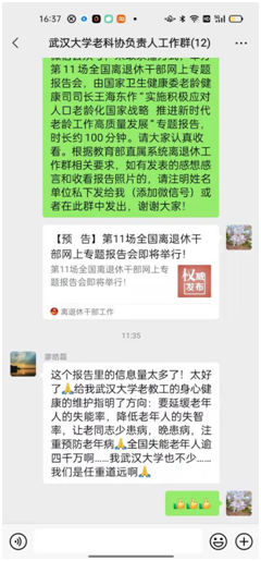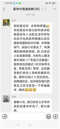 今天收听了第11场全国离退休干部网上专题报告会后,我深感生活在我们伟大祖国的老年人是多么幸运、多么幸福。党中央始终坚持以人民为中心,主动应对人口老龄化,用心用情用力,关心关怀老同志,尽职尽责为广大离退休老同志提供更为优质的服务,使其老有所学、老有所乐、老有所医,享有更为健康更为幸福的晚年生活,不断提高广大离退休老同志的获得感、幸福感、安全感。感恩祖国!感恩中国共产党!今后,我们必须继续坚持以习近平新时代中国特色社会主义思想为指导,不忘初心,与党同步,与国同行,积极发挥作用,为祖国发展大业贡献自己的力量!