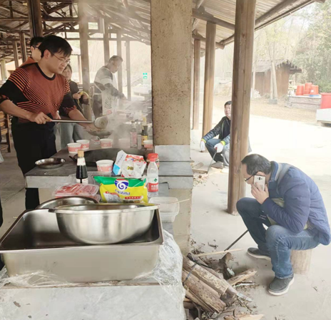 谷有田的午餐非常有特色,是大家自己亲自动手制作的柴火饭,同志们纷纷上阵,有的备菜,有的烧火,有的炒菜,最后在大家集体智慧下,烹饪了一桌色、香、味俱全的丰盛美食,我们品尝着自己的劳动成果,无不露出高兴和满意的微笑。