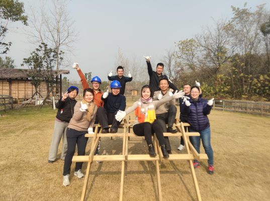 经过前两个游戏的热身后大家的情绪高涨,欢声笑语响彻整个操场。接下来进入到重点活动项目“桥梁搭建”。在这个项目里两个小组的成员都化身为建筑工人,根据图纸搭建简易桥梁。大家戴着安全帽和工装手套,拿着扳手、锤子、尺子等工具有条不紊搭建桥梁,大家兴致勃勃干的热火朝天。经过一个半小时,由刘金才带领的小队率先完成桥梁搭建,徐应荣带领的小队虽然历经时间稍长一点,但最终也顺利完成了任务。看着各组的劳动成果,大家纷纷感慨真是隔行如隔山,也深刻体会到建筑工人的不易和艰辛。最后大家纷纷站在桥梁上合影留恋。