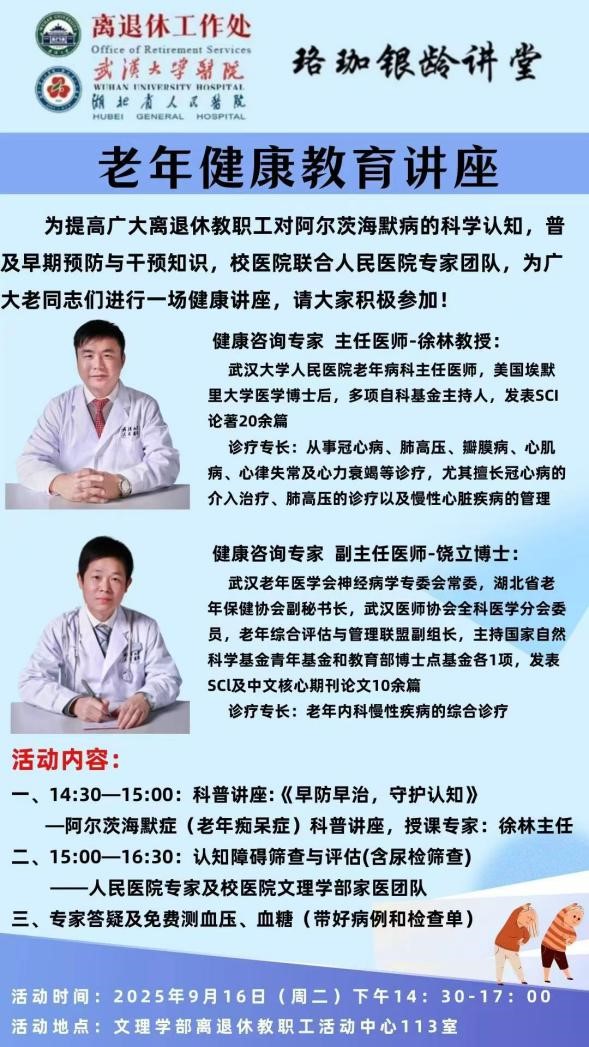 为了更好地服务广大离退休教职工,在世界阿尔茨海默症日(每年9月21日)前夕,新利18平台登录入口携手新利客服人民医院和校医院,于9月16日下午在文理学部离退休教职工活动中心,举办了以“早防早治,守护认知”为主题的阿尔兹海默症科普讲座,现场座无虚席。