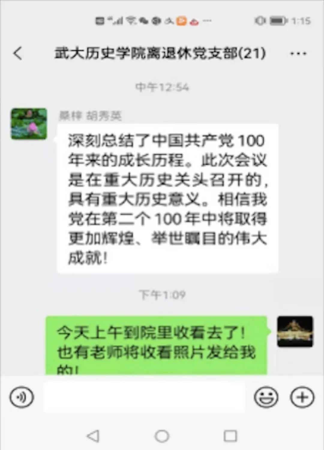 二区机关一支部汤耀垣老师特赋诗庆贺十九届六中全会胜利召开:“党史盛会京华开,人民欢庆乐开怀。百年建党金果硕,新百征程现代迈。自我革命创新展,百姓福祉使命裁。喜迎廿大争奉献,环球共建彩云排!”(胡珊)