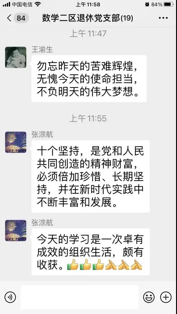 计算机学院85岁李鸣山老师在学习体会中谈到,“一个国家一个政党,领导核心至关重要。有了以习近平同志为核心的党中央坚强有力的领导,我们可以任凭风浪起,稳坐钓鱼船。在全球新冠疫情如此严重的情况下,生活在中国最安心、最放心。”