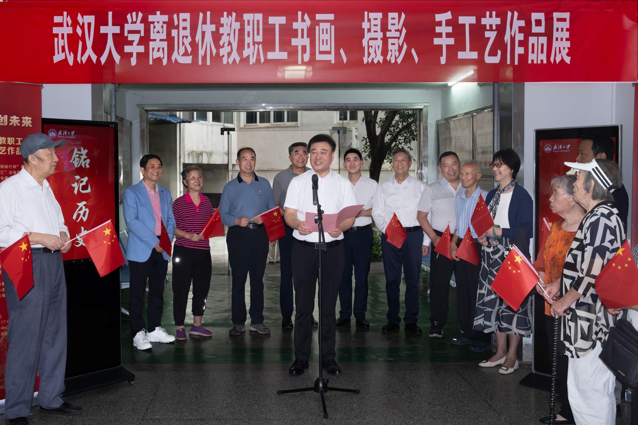 开幕式上,屈文谦致辞并宣布展览正式开幕。他指出,今年是中国人民抗日战争暨世界反法西斯战争胜利80周年,此次以“铭记历史·开创未来”为主题的展览,既是对光辉历史的深情致敬,也是对民族复兴伟大征程的美好展望。离退休教职工是学校建设发展的亲历者、奠基者和贡献者,始终心系国家、情系珈园,通过书画、摄影、手工艺等艺术形式,传递着深厚的家国情怀和昂扬向上的精神力量,展现了不忘初心、老有所为的银龄风采。当前学校正处在发展建设的关键时期,他殷切希望老同志们不忘初心、牢记使命,发挥经验优势、积极建言献策,继续为学校发展贡献“银发力量”。