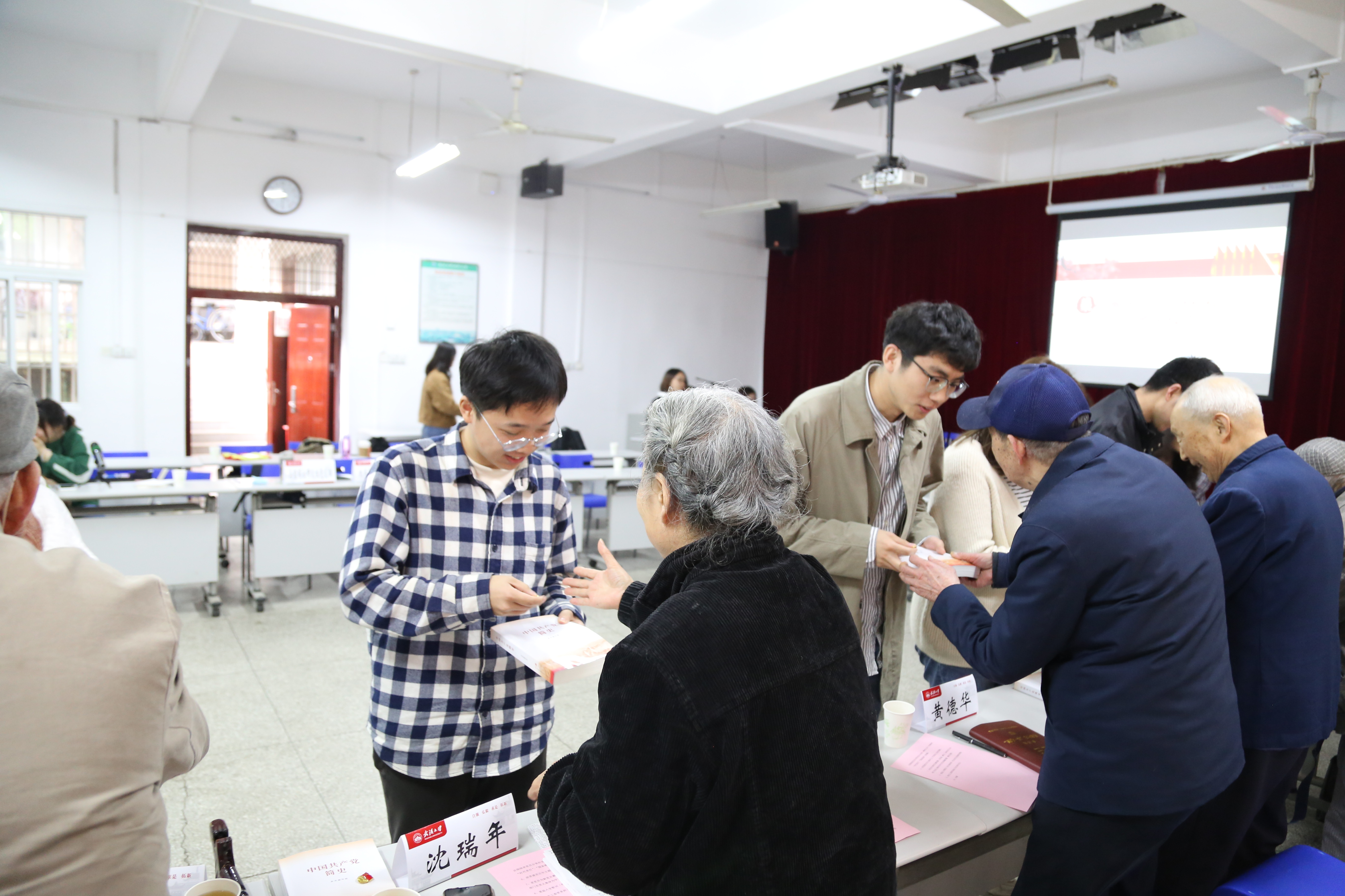 在建党百年主题MV《当我别上这枚党徽》音乐声中,离休干部党员现场为学生党员代表佩戴党员徽章,赠送党史学习书籍,并送上美好祝福,寄予殷切期望,希望青年党员们不断锤炼党性,走好人生的每一步,在实现“中国梦”的接力跑中,努力跑出优异成绩,以“青春之我”助力中华之腾飞。