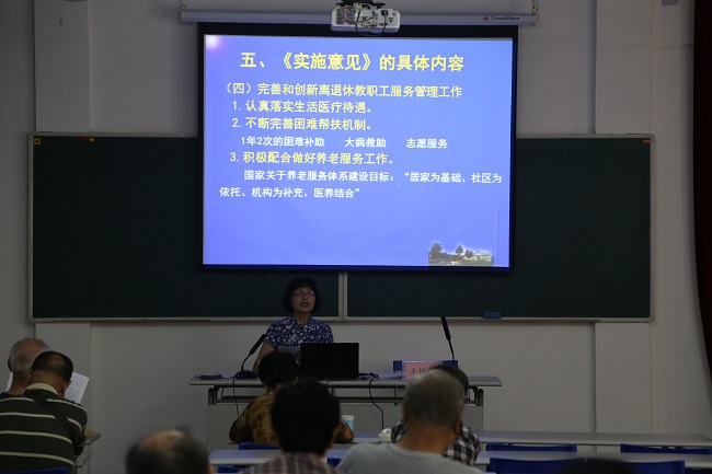 彭若男处长从四个部分进行了情况通报。一是传达学习《新利客服关于进一步加强和改进离退休工作的实施意见》(武大党字【2017】36号)文件精神;二是通报巡视工作有关情况;三是传达暑期干部培训班的精神;四是离退休工作情况通报。
