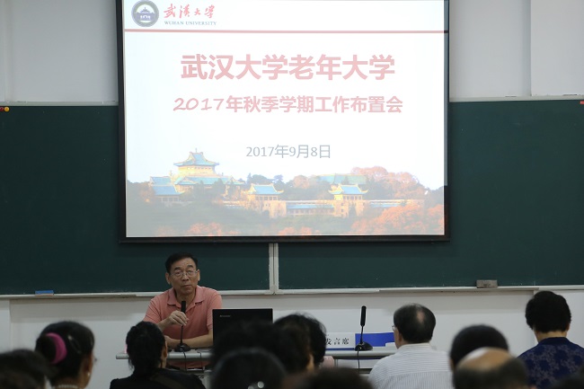 老年大学常务副校长张诗荣传达了第六次全省老年大学校长培训班暨全省老年大学校园文化建设经验交流会的精神,重点传达了省委老干部局局长马在学的讲话。并安排了秋季学期的主要工作和活动:一是认真学习贯彻党的十九大精神,开展庆祝党的十九大的系列活动;二是认真学习贯彻武大党字〔2017〕36号文件精神,全面加强老年大学建设;三是进一步贯彻落实国务院老年教育发展规划精神,制定出台老年大学实施意见;四是开展争先创优和“风范长者”的评选表彰活动;五是继续开展“手牵手”活动,筹建和成立“珞珈情”志愿服务团队;六是成立理论宣传组,进一步加强理论研究和宣传工作;七是做好申报全国高校老年大学示范校的准备工作。