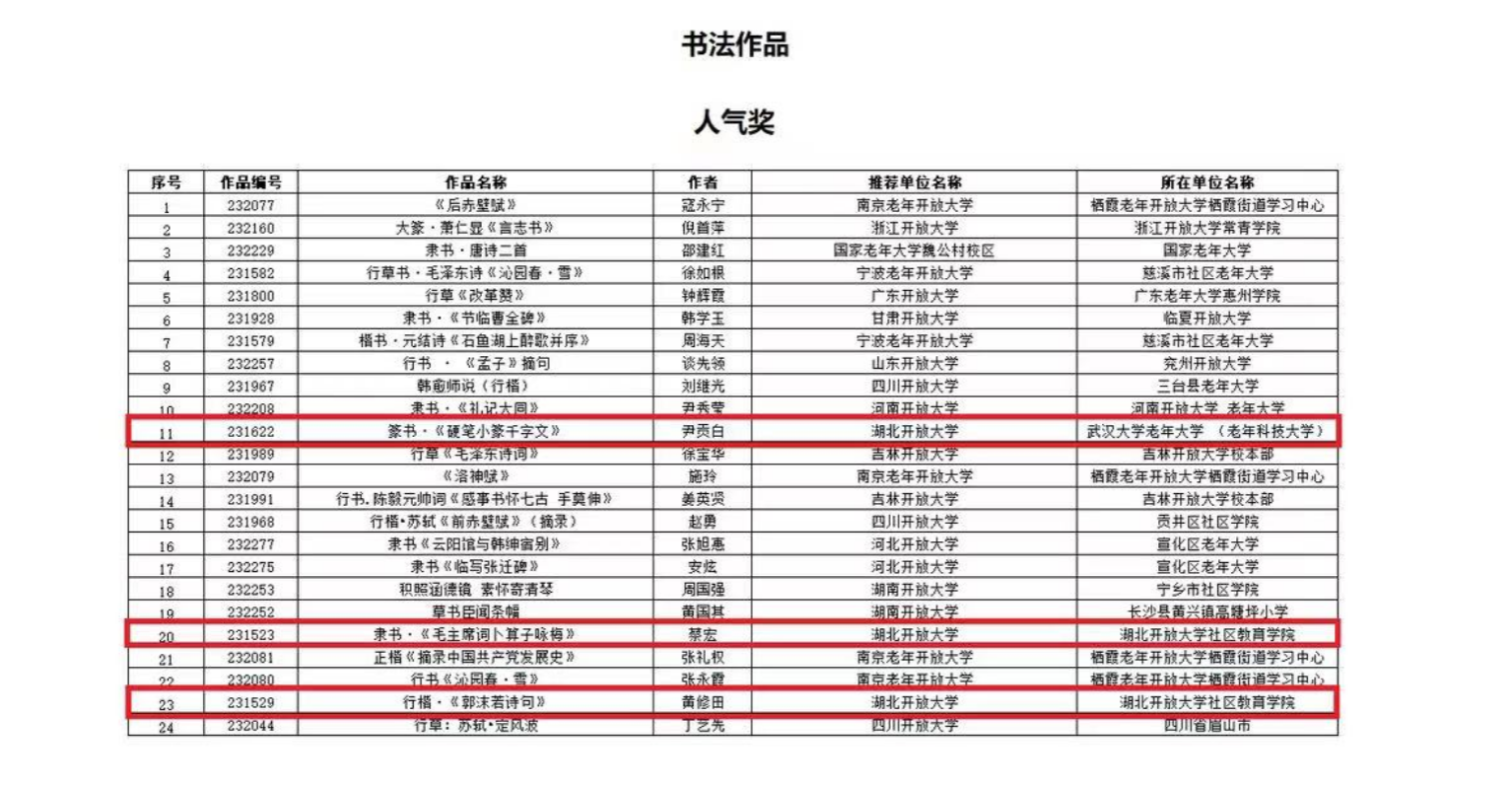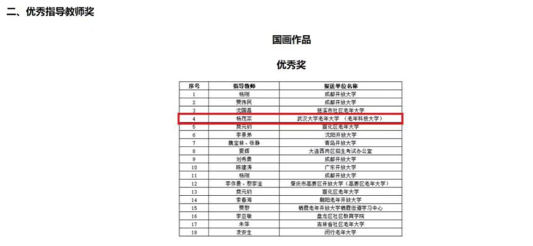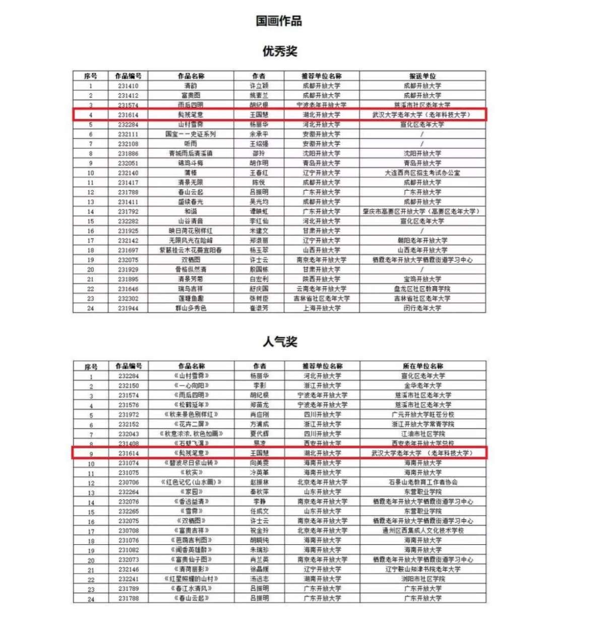 近日,国家老年大学公布了2023年全国老年教育书画类教学成果展评选结果,我校尹贡白老师《篆书硬笔小篆千字文》获书法作品人气奖;王国慧老师的《髡残笔意》获国画作品优秀奖和人气奖;杨宗茂老师获国画作品指导教师优秀奖。