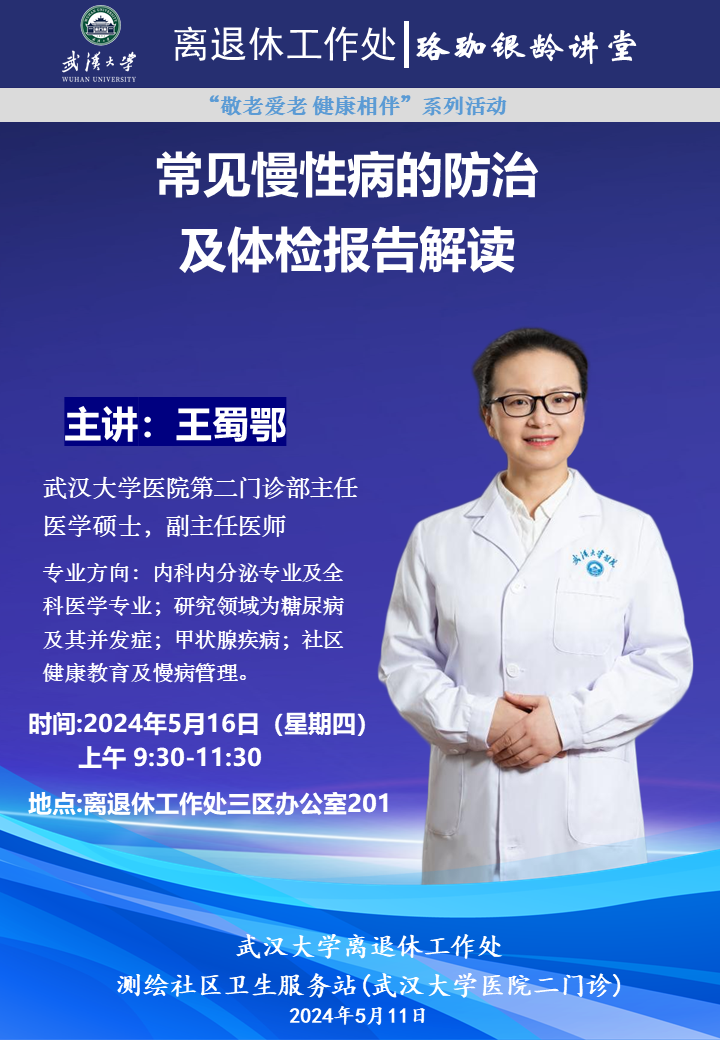 为普及慢性病知识,科学解读体检报告,提高离退休老同志的健康管理意识与自我保护能力,满足老年人对健康生活的需求。5月16日上午,新利18xl持续开展“珞珈银龄讲堂”第六期之“敬老爱老 健康相伴”系列活动。