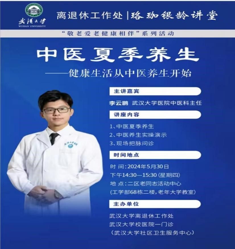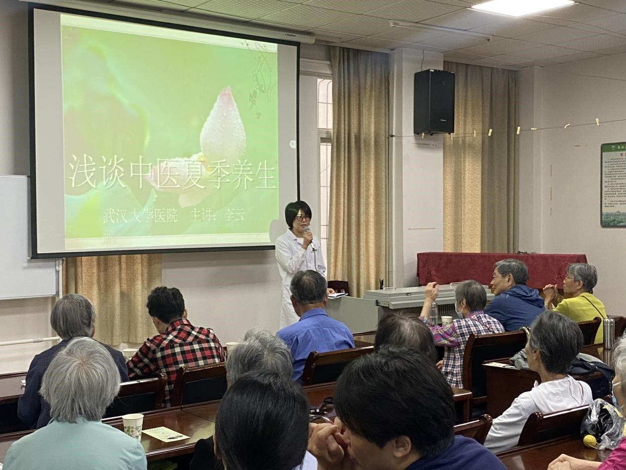 正值夏季养生之际,为普及夏季养生知识,提高离退休教职工的健康知识水平和预防疾病的能力,5月30日下午,珞珈银龄讲堂之“敬老爱老 健康相伴”系列活动——中医夏季养生健康知识讲座(第二期)在新利18xl二区老年活动中心成功举办。活动邀请到新利客服医院中医康复科主任李云鹏医生作为主讲嘉宾,为老同志带来了主题为“中医夏季养生”的健康讲座。