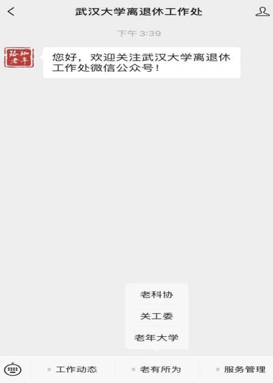 方式2:在微信上搜索并关注公众号“新利18平台登录入口”,点击“老有所为”中“老年大学”。(如下图)