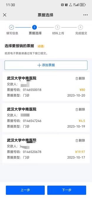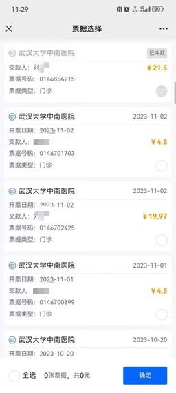 2、上传新利客服中南医院、口腔医院电子票据时,系统已实现自动上传费用清单,只需要勾选发票。人民医院暂时未实现自动上传费用清单,须报销人拍照上传。