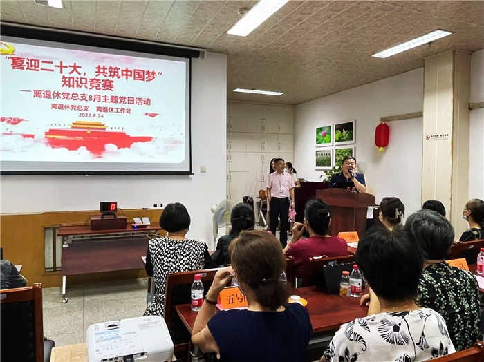 8月24日下午,由离退休党总支、新利18xl主办的“喜迎二十大 共筑中国梦”党的知识竞赛,在新利18xl大会议室举行,来自各退休党支部的九支代表队27名选手参加竞赛,医院党委常委、总会计师杨发勇出席本次活动,老协会长赵克勤、杨国樑担任总裁判,离退休党总支书记王宁主持。