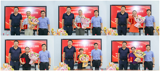 “向工作期间给予帮助支持的领导、同事们表示感谢”“我人退心不退,会时常关注图书馆的发展,希望明天更好”“用得着我的时候,打个招呼”……六位老师温暖而真挚的发言,道出了每位荣休职工的心声。他们是广大荣休职工的缩影,代表着一群辛勤工作、无私奉献的武大图书馆员形象。他们在各自岗位的执着坚守和辛勤耕耘,为图书馆的建设和发展作出了重要贡献。在热烈的掌声中,董有明馆长和尤传明书记依次为每位退休职工颁发荣休证书并献花,表达图书馆对他们的诚挚谢意与真切祝福。