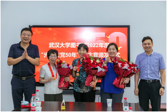 仪式的第二项议程,尤传明、董有明为到场的党龄达到50年的老党员同志们颁发了“光荣在党50年”纪念章,并送上鲜花、合影留恋。戴上纪念章,大家纷纷回忆起峥嵘岁月,讲述心得感悟。图书馆老党员代表、退休第一支部副书记刘啸冰以“一生努力为党工作!”作了一堂生动党课,她回顾了自己在部队里积极进取、光荣入党和在图书馆工作期间认真学习专业知识、投身工作实践的经历。退休后她积极主动承担着党支部和老协工作,为退休党员、职工热情、热心做好服务,疫情期间克服重重困难,紧密联系党员群众配合开展抗疫工作。作为共产党员,她始终认为要从点滴工作入手,把党的关心关怀送到老师们的心坎上。周小萍、黄玉英等老同志也依次分享了在党的教育下矢志不渝听党话、跟党走,为党奉献、感怀党恩的感悟,并表示将继续为党的事业发展发光发热。