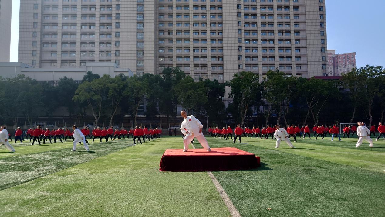 在八段锦和缓的音乐声中,李志祥老师和他带领的太极拳队站在表演队伍前面,100多位退休职工以支部为单位迅速拉开架势开始了精彩的表演。队伍中有年轻的面孔,有白发苍苍的老同志,其中5位85岁以上的老师凝神贯注,随着音乐舒展经络。表演的老师们一招一式行云流水、整齐划一。