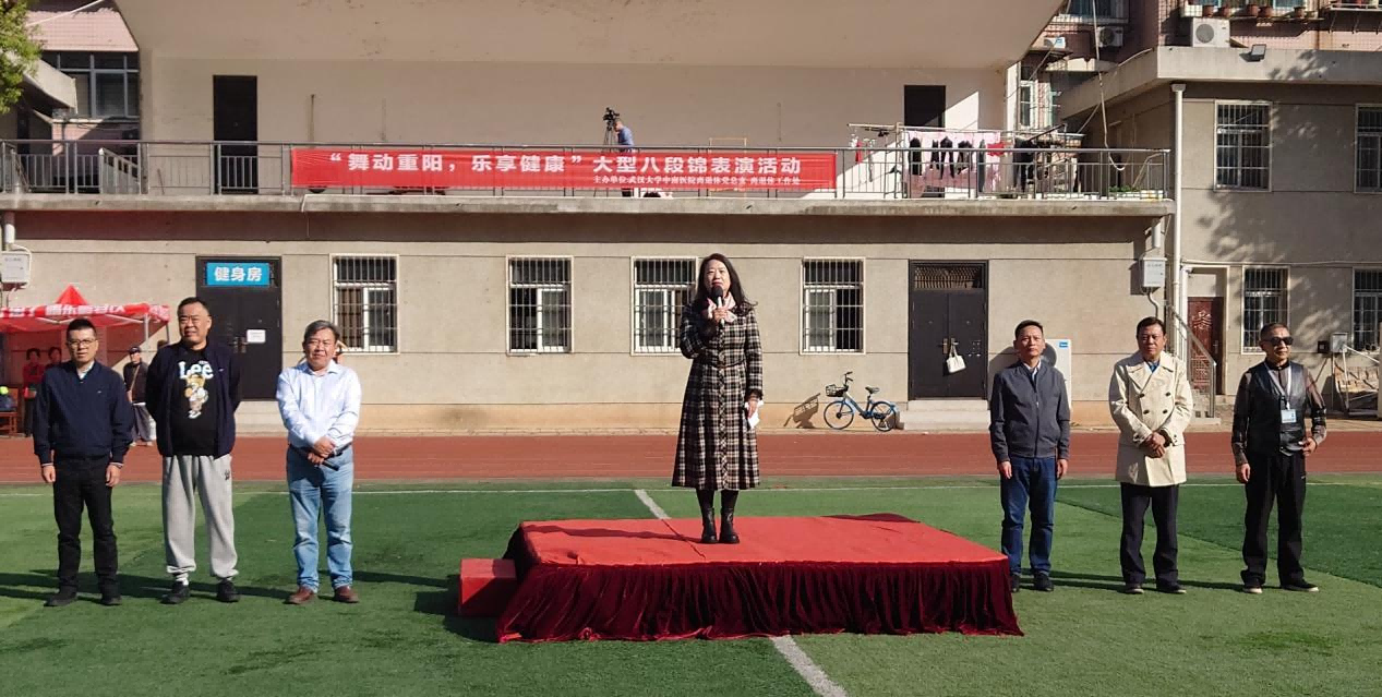 秋衣浓浓,今日正好。10月24日上午,离退休党总支、新利18xl举办“舞动重阳 乐享健康”八段锦大型表演活动。新利18平台登录入口四校区主任舒坦、副主任殷书文,中南医院内科党总支书记陈钢、外科党总支书记邓力受邀参加,离退休党总支书记王宁主持。