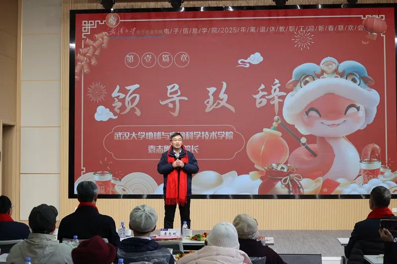 李德识代表学院向离退休教职工及在座人员致以节日的问候,并介绍了2024年度学院在人才引进、学科和平台建设、科研、人才培养、综合管理等方面的发展情况,重点介绍了部分人员分到新组建的地球与空间科学技术学院的情况,并展望了学院未来的发展蓝图。同时,向离退休教职工对学院建设发展中作出的贡献表示衷心的感谢。珞珈山水敬贤长,他表示,2025年学院会继续进一步提升离退休人员生活质量与归属感。