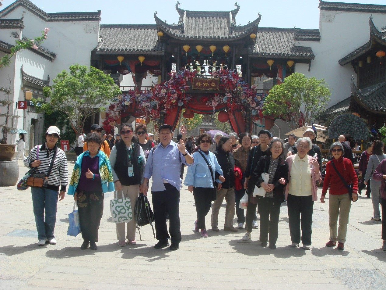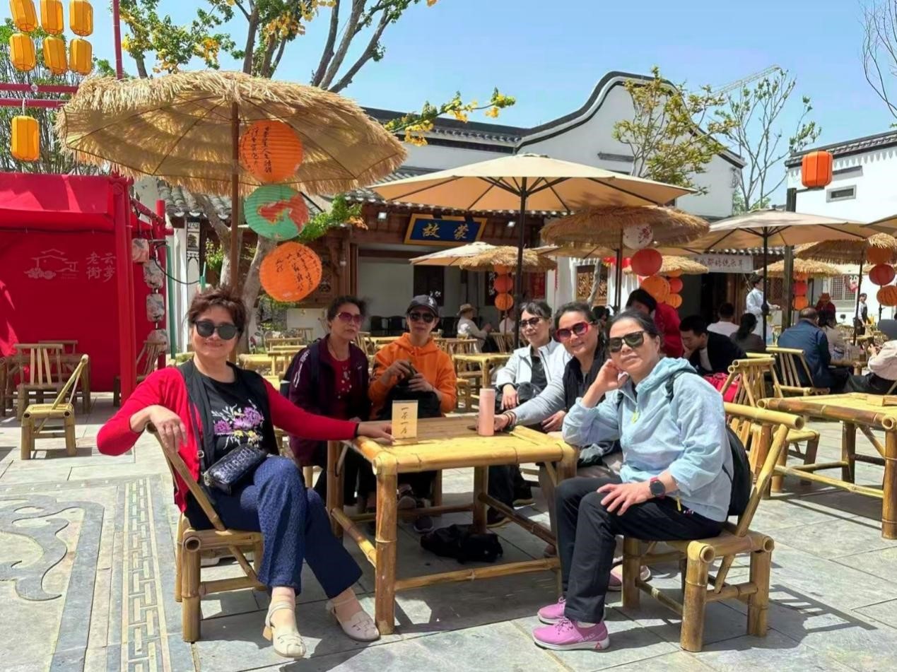 经过一个半小时的车程,老同志们抵达祥云湾景区。在导游的引导下,他们首先穿过“祥云湾”门楼,于北门广场合影留念。随后,一行人依次游览了”五福楼”“鼓楼”“四喜楼”“三多楼”等标志性门楼,最终抵达祥云广场。广场中央的舞台上,歌舞表演正酣,传统乐曲与轻盈舞姿相映成趣,引得老同志们驻足欣赏。沿景区南行,穿过“二圣楼”门楼后,一条蜿蜒的小河映入眼帘。河上游船穿梭,两岸店铺林立,小桥流水串联起江南园林的雅致韵味。据介绍,云梦老街片区以“高度还原古建原貌”为宗旨,结合现代设计理念,打造了一座集古建筑、传统园艺与文化体验于一体的“大观园”。老同志们或驻足品评建筑细节,或拍照记录春日胜景,对景区的匠心修复赞不绝口。目前,祥云湾其他片区仍在建设中,未来有望成为武汉周边古建旅游的新名片。