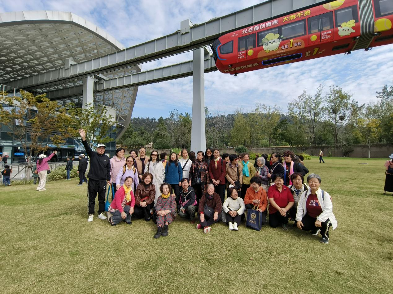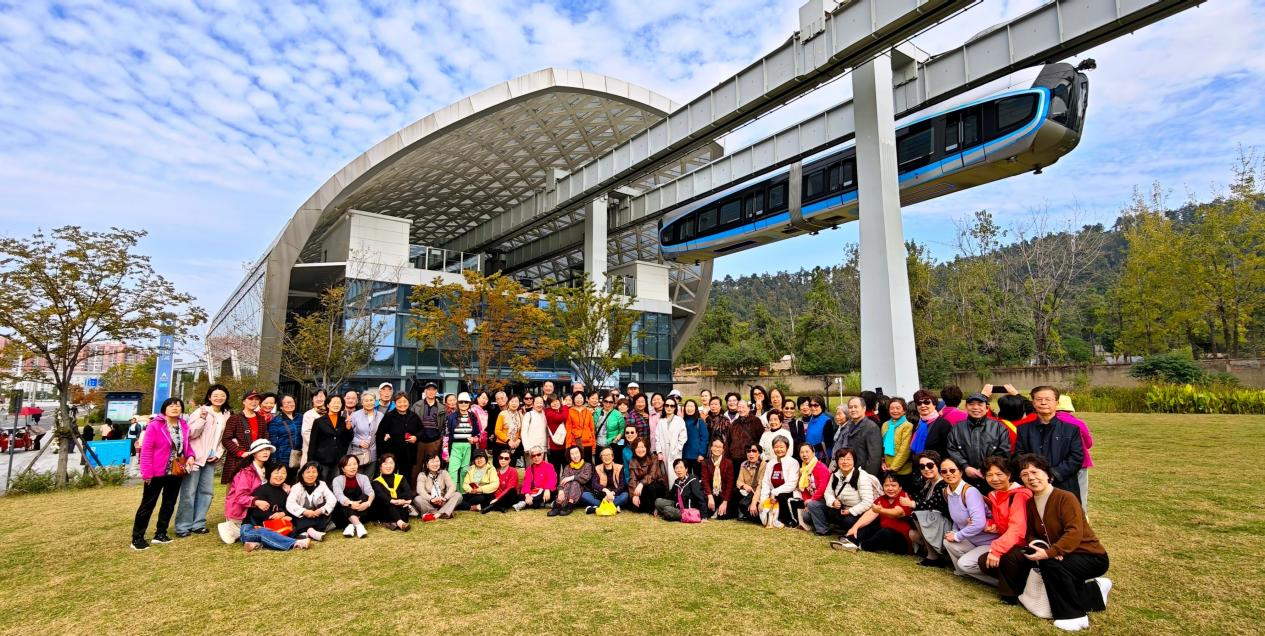 随后,退休馆员们共同体验了科技感十足的空轨交通。列车在城市上空缓缓穿行,车窗宛如流动的画卷,将秋日江城的天高云淡、层林尽染以及城市建设的崭新面貌尽收眼底。大家凭窗远眺,欣赏着窗外掠过的湖泊、山色与现代楼宇,纷纷拿起手机拍照留念,记录下这美好瞬间。车厢内充满了欢声笑语,老同事们久别重逢,亲切交谈,互致问候,关切地询问彼此的近况,温馨与喜悦的气氛洋溢在整个旅程之中。