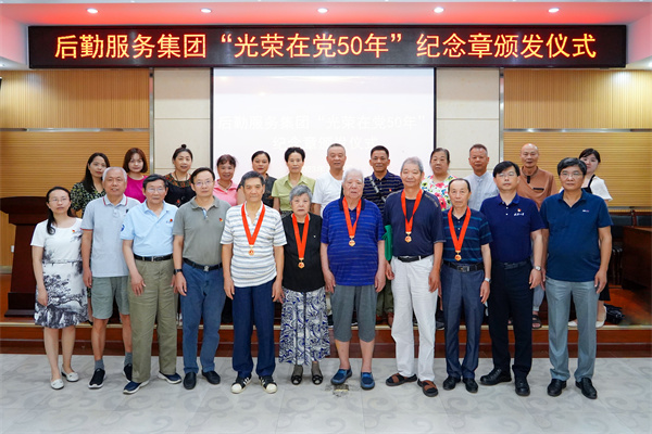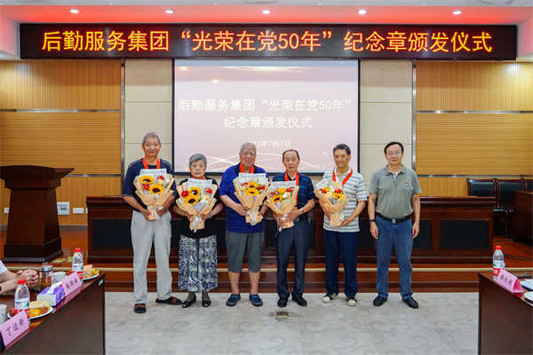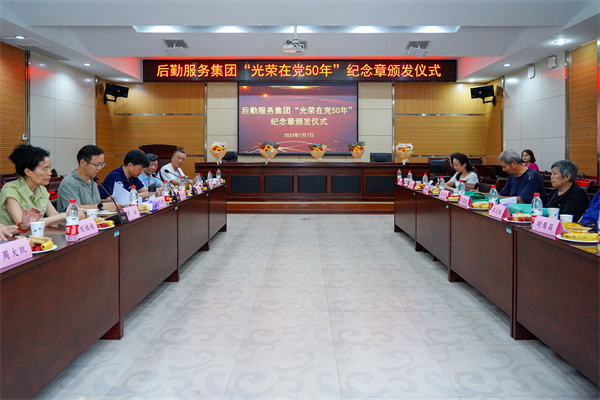 2023年是中国共产党成立102周年。为表达对老党员的关心关爱,把党组织的关怀与温暖送到老同志身边,7月7日上午,后勤服务集团举办“光荣在党50年”纪念章颁发仪式暨离退休党员代表座谈会。集团党委书记彭启智出席仪式,“光荣在党50年”老党员、集团离退休党总支书记、离退休党支部书记及支委代表,集团工会副主席、党政办副主任参加。集团副总经理葛枫主持。