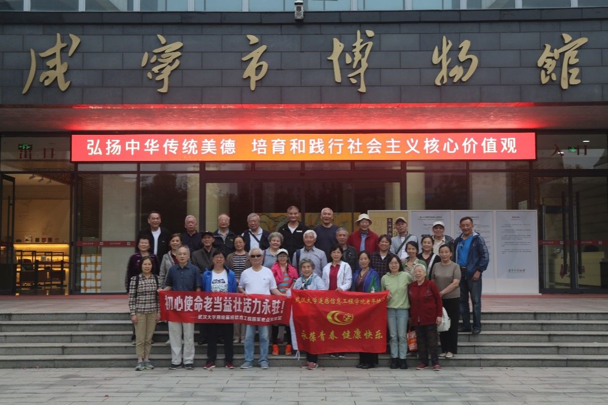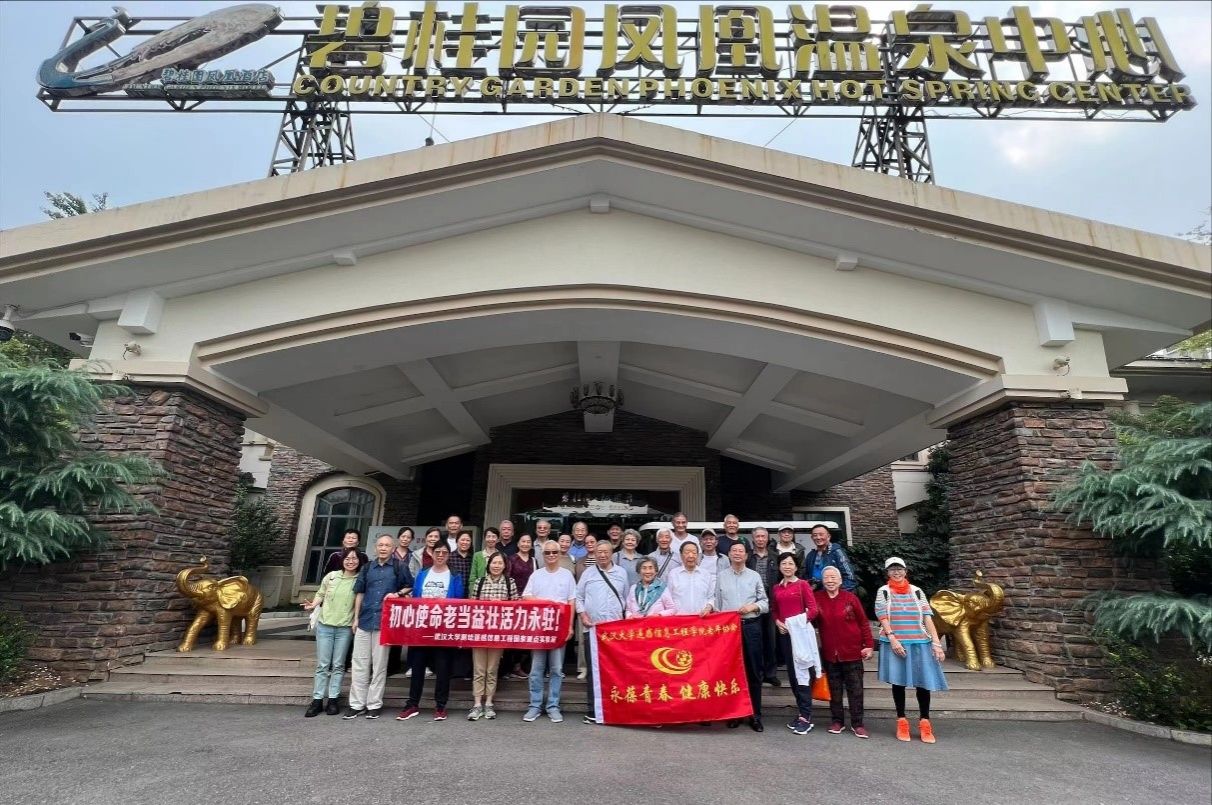 10月19日,遥感学院离退休老师中有一半以上七八十岁以上的老老师!重阳节秋游,院老协在踩点调查后,采取自愿报名、组织了离退休教师28人到著名的咸宁温泉泡温泉和参观咸宁市博物馆。院党委书记雷敬炎亲自参加了半日老协活动,又赶回学校开会。院里还安排办公室周卉主任陪同服务、摄影和照顾老年老师,确保秋游安全,她没下水。老师们沿途看山水风景,赏桂乡咸宁市繁华街景和桂花大道桂花,品桂花酒,吃吊锅,泡十余种不同香料和药物温泉,温泉水温45°C左右,每次泡5分钟换一个池子,冬泳老运动员86岁的陈汉元老会长泡的满头大汗,一直欢声笑语!几乎所有老人返老还童十分开心!