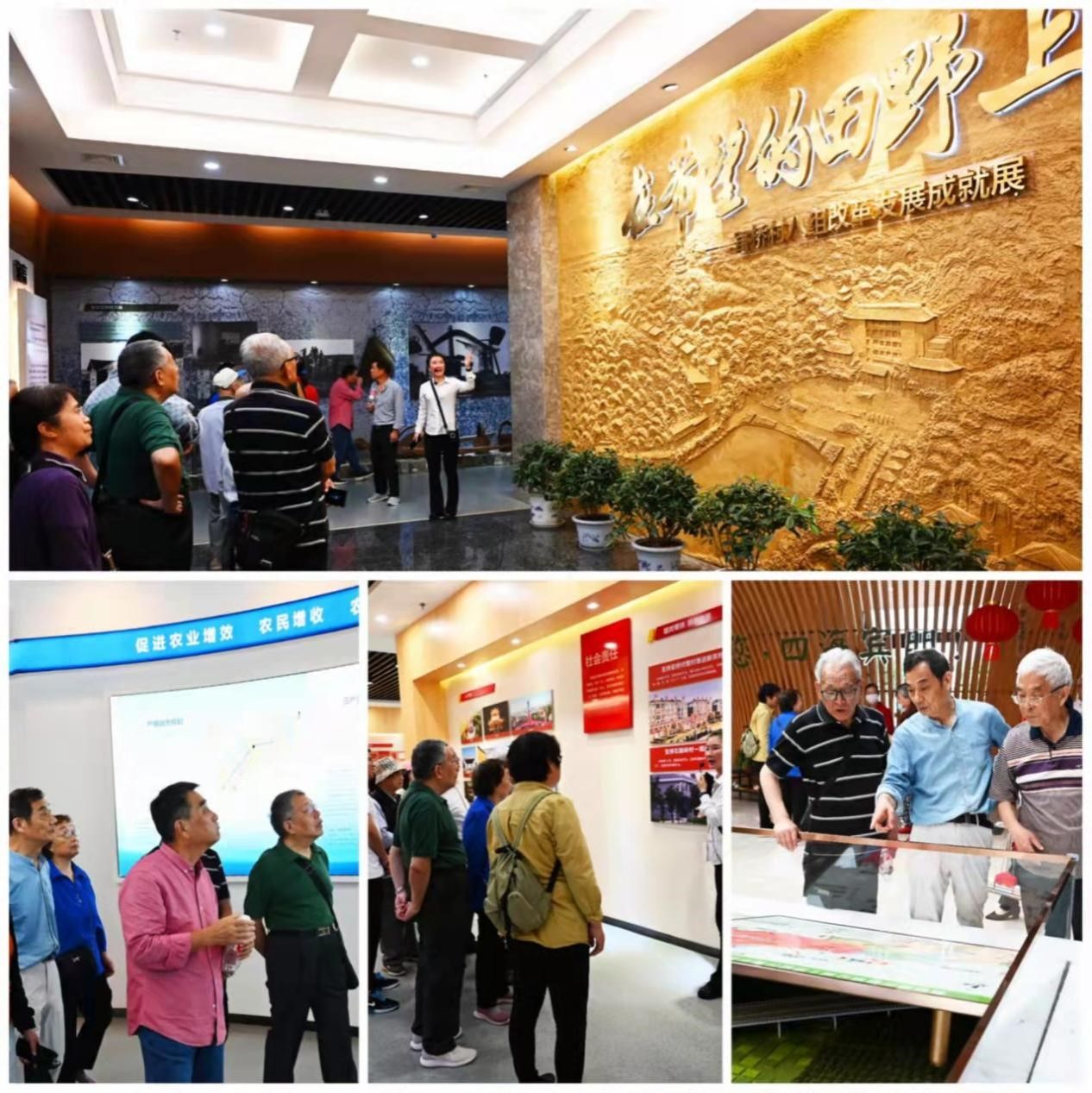 老师们精神矍铄,一上车就相互兴奋地打招呼聊起来,一路上欢声笑语,顺利到达被誉为湖北第一组的官桥八组。这里绿树成荫,鲜花盛开,微风拂过,带来清新的草木香气,让人心旷神怡。一行人下车伊始,就在田野农博馆邓小平塑像前合影留念。继而进到展厅,映入眼帘的是一面巨大的浮雕墙,“在希望的田野上”七个大字画龙点晴,彰显官桥八组(田野集团)40多年始终充满希望,始终走在正确的发展道路上。徐绍建老师步伐轻快,拿着随身带的小平板,和党政办李少峰老师一起,给大家拍了很多美照。老师们随着讲解员,移步换景,边听边看,纷纷赞叹改革者思想观念新,改革步子大,成果丰硕。