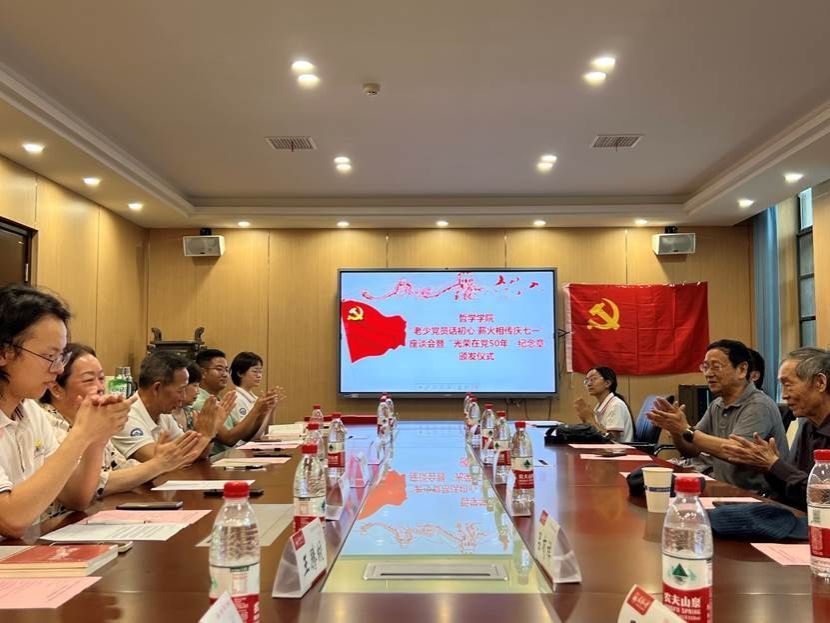6月19日下午,哲学学院“老少党员话初心 薪火相传庆七一”座谈会暨“光荣在党50年”纪念章颁发仪式在振华楼B301会议室举行。哲学学院党委书记卢昌宁、副院长陈蓓、退休党支部党员代表、学院行政人员程么娥、刘秀慧及宗教学研究生党支部党员代表等参加此次活动。仪式由退休党支部书记程焱发同志主持。