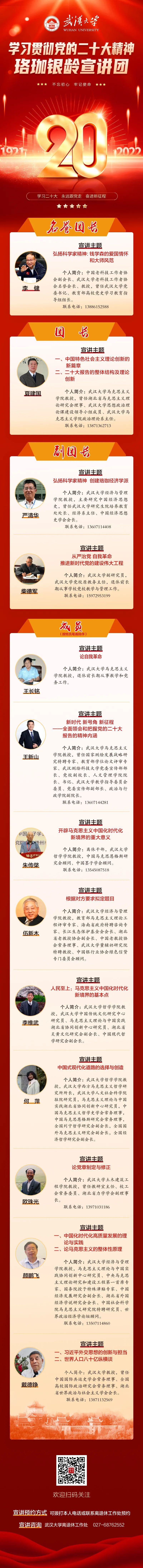 现将珞珈银龄宣讲团成员信息和宣讲主题予以公布,正式开放宣讲预约!
